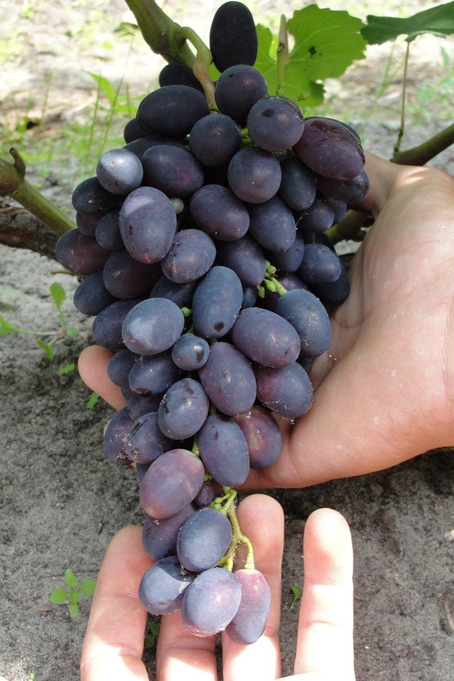 Плодоносить начинает на 2-й год после посадки или прививки, лоза вызревает быстро. Отличный столовый сорт, имеет умеренно «набитые» грозди, средний вес которых составляет около 0,6 кг, могут достигать массы в 1 кг, при этом имеют презентабельный товарный вид. Сами ягоды крупные, вытянутой формы, достигают 3 см в длину и имеют 7 г веса. Темные, с почти фиолетово-черным окрасом ягоды покрыты густым восковым налетом. При созревании ягоды не растрескиваются.